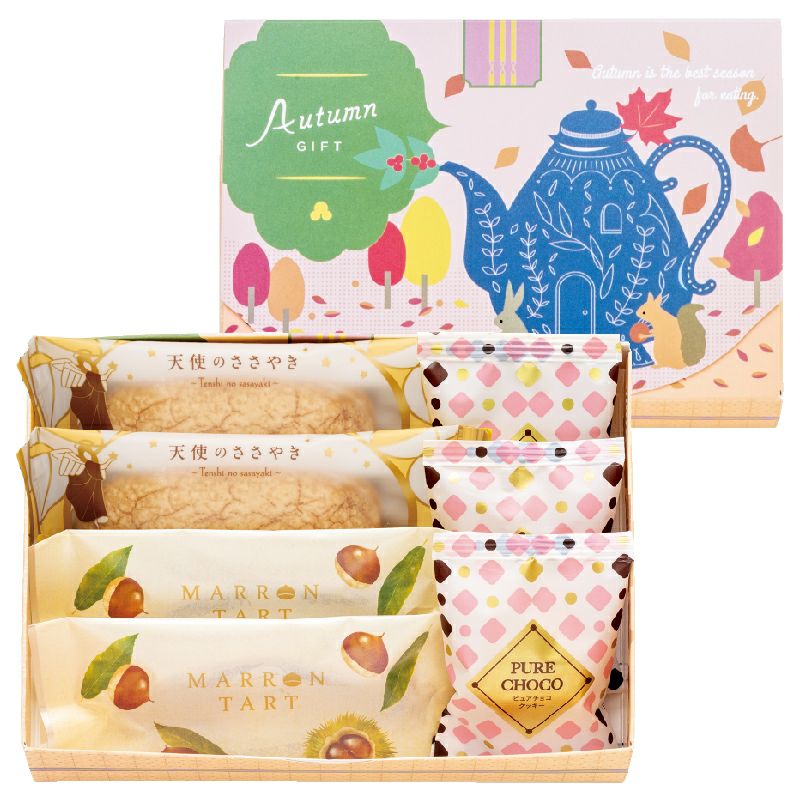 フェア限定の「天使のささやき(マロン)」「マロンタルト」と定番の焼菓子「ピュアチョコクッキー」を詰合せた季節のギフトセット。見た目もかわいい青木松風庵オリジナルの秋のギフトBOXに入れてお届けいたします。