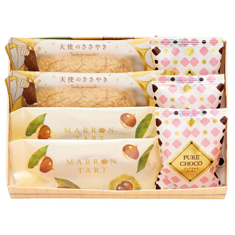 内容量 天使のささやき(マロン) 2個、マロンタルト 2個、ピュアチョコクッキー 3個