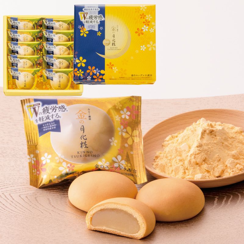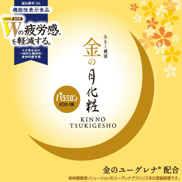 金のユーグレナを練り込んだ皮で北海道産いんげん豆を使い自家製餡したみるく餡を包みました。金の月化粧1個に機能性関与成分ユーグレナグラシリスEOD-1株由来パラミロン(β-1,3-グルカンとして)350mg(1日摂取目安量)を配合しました。