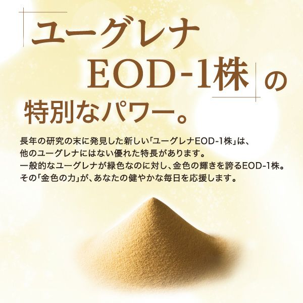 届出表示: 本品にはユーグレナグラシリスEOD-1株由来パラミロン(β-1,3-グルカンとして)が含まれます。ユーグレナグラシリスEOD-1株由来パラミロン(β-1,3-グルカンとして)には、日常生活における一時的な精神的・身体的疲労感を軽減する機能があることが報告されています。