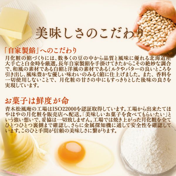 おかげさまで、2秒に1個売れています 「喜ばれお菓子」 月化粧がオススメの理由 ところでモンドセレクションの最高金賞って何? 月化粧を召し上がられた喜びの声をご紹介します。 当店は、創業以来、徹底して素材にこだわっております。 青木松風庵は自家製餡 月化粧は大変多くのメディアに取り上げられています。