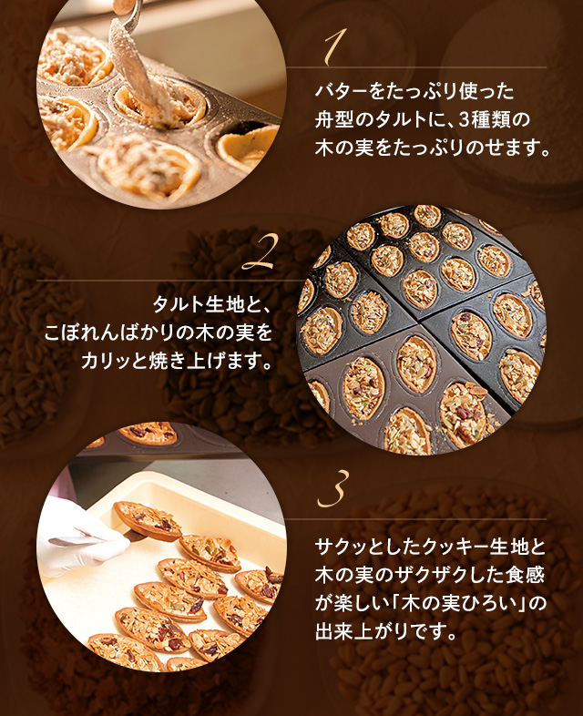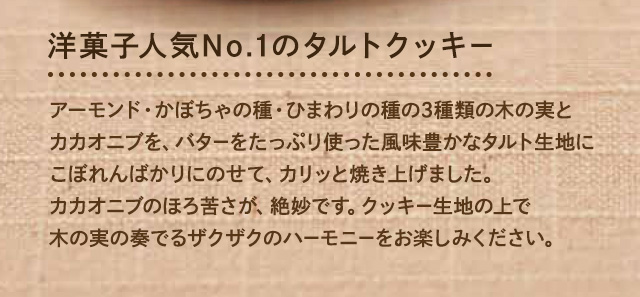 アーモンド・かぼちゃの種・ひまわりの種の3種類の木の実とカカオニブをバターをたっぷり使った風味豊かなタルト生地にこぼれんばかりにのせて、カリッと焼き上げました。クッキー生地の上で木の実が奏でるザクザクハーモニーを是非お楽しみください。