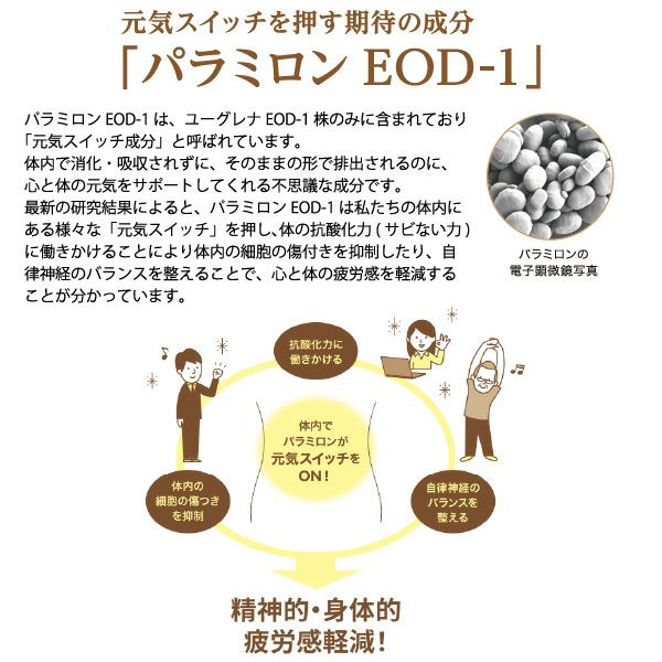 届出表示: 本品にはユーグレナグラシリスEOD-1株由来パラミロン(β-1,3-グルカンとして)が含まれます。ユーグレナグラシリスEOD-1株由来パラミロン(β-1,3-グルカンとして)には、日常生活における一時的な精神的・身体的疲労感を軽減する機能があることが報告されています。