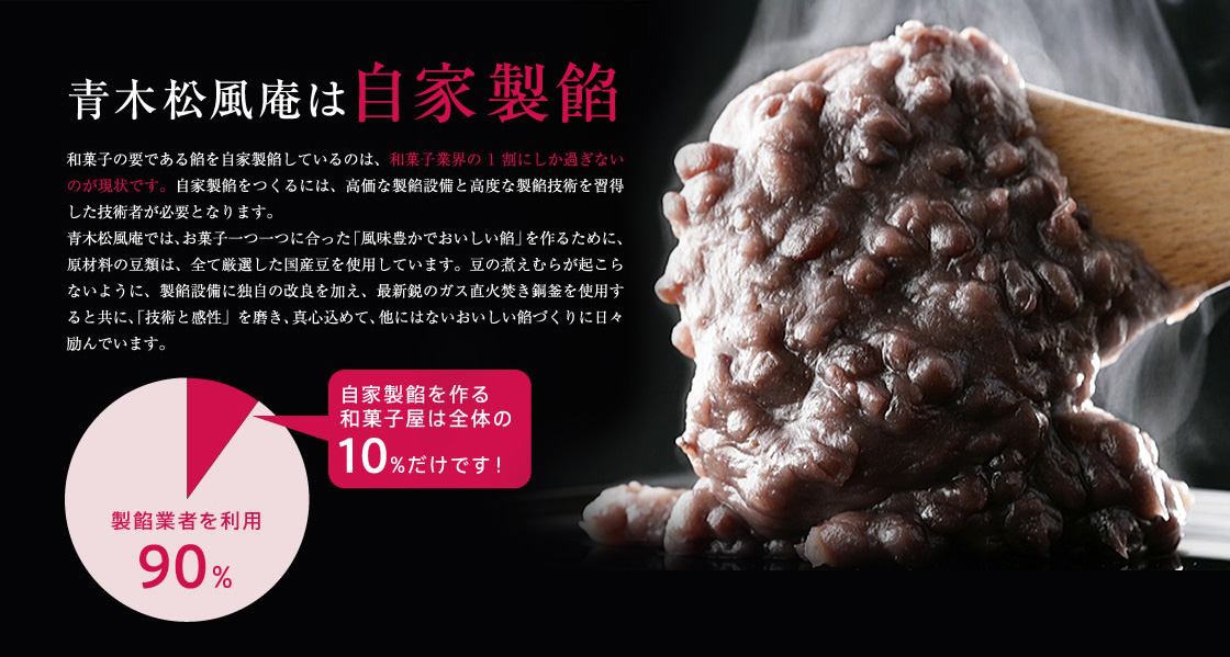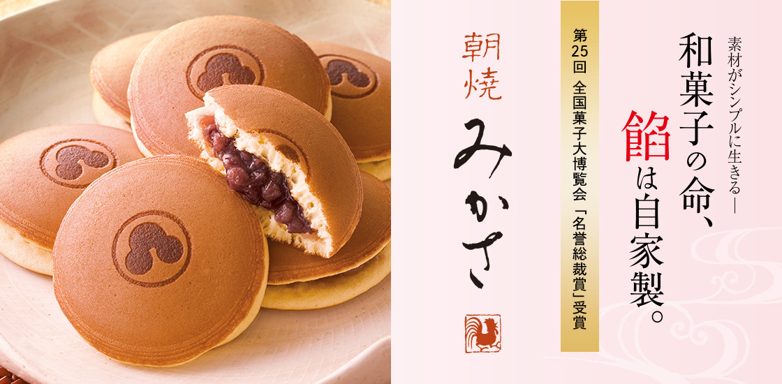 当日分のみ製造する究極のどらやき。できたての美味しさを届けたいとう思いから、毎日早朝から当日発送分のみを焼き上げ、発送しております。また、創業以来100%自家製餡にこだわっている松風庵のみかさは、全国菓子大博覧会名誉総裁賞を受賞し、当店自慢の逸品です。