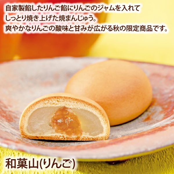 自家製餡したりんご餡にりんごジャムを入れて、しっとり焼き上げた焼饅頭。爽やかなりんごの酸味と甘みがお口に広がる限定商品です。