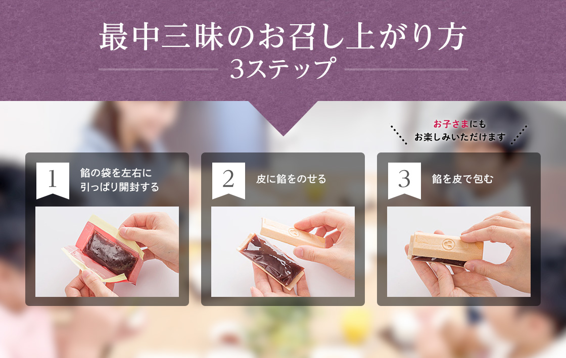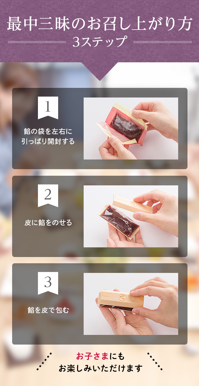 「できたての香り」を感じていただきたいからこそ、餡とは別々の状態でお届けいたします。