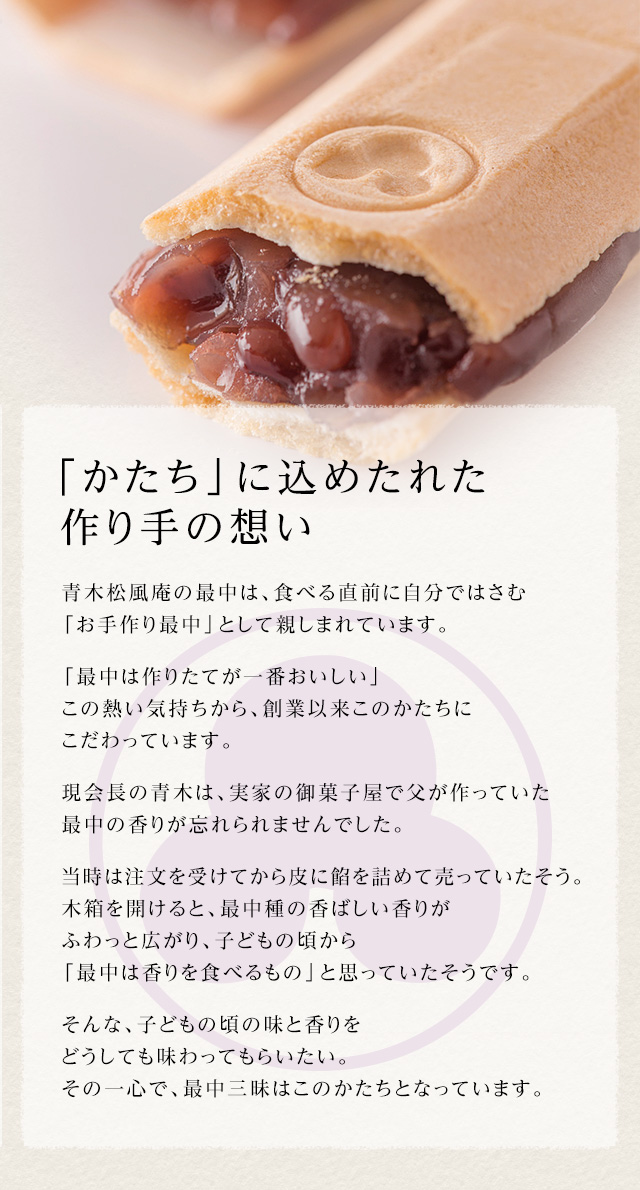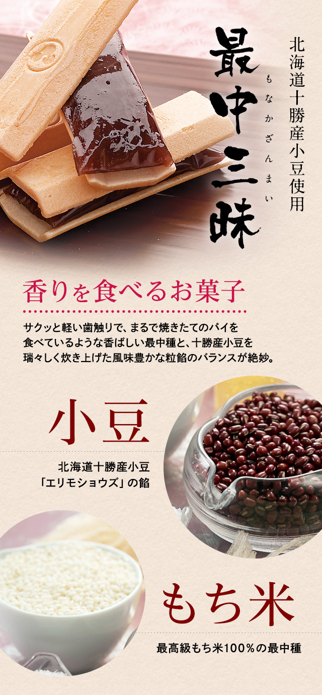 もち米を100%使用した最中種の芳ばしい香りと、北海道十勝産小豆の自家製餡。皮のさくさく感と餡の瑞々しさはお手作りならではの逸品です。